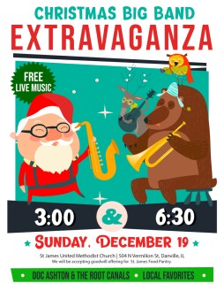 Doc Ashton and the Root Canals expand their group to a 20 piece jazz big band for the Doc Ashton and the Root Canals Christmas Big Band Extravaganza at St James United Methodist Church in Danville. The program is all Christmas big band music. The free concert is on Sunday, December 19th at 3:00 and 6:30pm. Several vocalists will perform with the band. This family friendly program is great holiday fun! Cookies and holiday punch will be served after each performance. See you there!