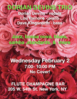 Dorian Devins Trio performs jazz and vocal standards, bossa nova, blues, samba, pop and more. 7:00 - 10:00 PM Live at Flute Champagne Bar in Manhattan. NO COVER! Dorian Devins - vocals Lou Rainone - piano Dave Kingsnorth - bass Flute Bar 205 West 54th St (between Broadway & 7th Ave) New York, NY Flute is a cozy champagne bar, featuring drinks and great food and music.