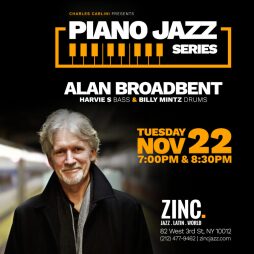 Acclaimed jazz pianist Alan Broadbent brings his trio to the Zinc Bar for a splendid evening of jazz piano on Tuesday, November 22. He's supported by bassist Harvie S and drummer Billy Mintz.
