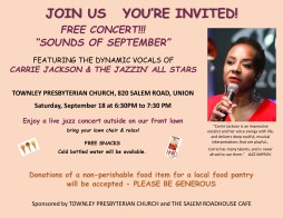 TOWNLEY PRESBYTERIAN CHURCH together with The SALEM ROADHOUSE CAFÉ proudly present CARRIE JACKSON & THE JAZZIN’ ALL STARS, performing on Saturday, 18 September, 2021. This will be a free concert on the church front lawn, open to all. CARRIE JACKSON is a metropolitan area based vocal stylist and rekindles thoughts of America's great jazz history. Carrie credits her mentors the great ladies of jazz; Sarah “Sassy” Vaughan, Ella Fitzgerald, Nancy Wilson, Carmen McRae, Dinah Washington, Billie Holiday, and others as a primary musical influence for her style, which indelibly helped shape vocal jazz for every generation. Carrie attributes her vocal style of singing from her mentors and made them a part of her, also bringing new horizons to this classical American art form called Jazz. The truth is that she has a bit of all of them and more that is uniquely her own style and proudly carries the jazz banner. Carrie is a vocalist and performer, a native of Newark, NJ, and honed her many talents in the jazz mecca of performing arts while performing throughout the USA and abroad. She spreads and shares her joy and well-honed expertise on the stage. Ms. Jackson, with her multifaceted singing style, can harmonize swing and scat, swings classic jazz standards with sweet soul; wails the blues, cabaret, pop tunes, ballads, or Gospel, all complimented by her engaging stage presence and graceful moves. Carrie has a wide range with a strong command of the classic elements of jazz vocalizing. She is a gifted lyricist, has great timing and truly sings from her heart and is comfortable performing with a Small Ensemble, Big band and or Orchestra. All ages are welcome. It's a wholesome show, so bring the entire family! Don’t forget to bring your lawn chairs!! Plenty of safe outdoor space. The show starts at 6:30 P.M. until 8:00 P.M. Free snacks will be available. Donations of a non-perishable food item for a local food pantry will be accepted – please be generous. Where: Townley Presbyterian Church, 829 Salem Road, Union, NJ 07083 When: Saturday, 18 September, 2021 Web: www.townleychurch.org Facebook: www.facebook.com/townleychurch Phone: 1-908-687-1028 (leave a message and a return number)